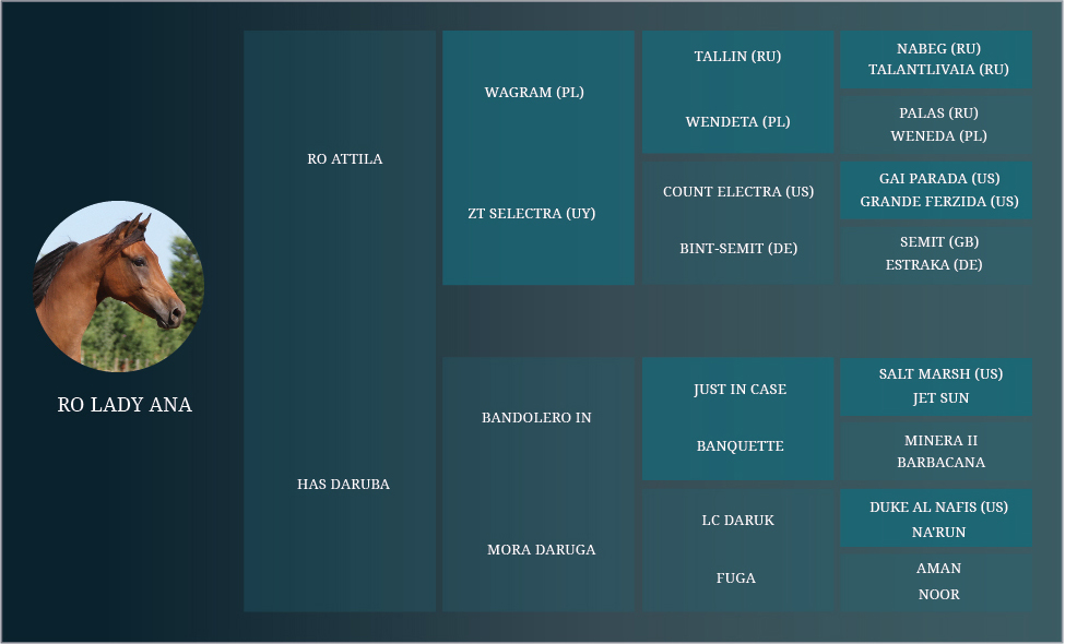 Yegua angloárabe (75% árabe), hermana materna de RO Hamlet (Wagram (PL)) ganador de la HH Sh. Mohammed Bin Rashid Endurance Cup for Pvt. Stables, CEN 119 km en Dubai, Emiratos Árabes Unidos en diciembre de 2018 y RO Lancelot (Wagram(PL)) ganador de CEI1* 80 km en Junín, Argentina en 2015; y hermana paterna de RO Liberal, RO Othar y RO Shy Doll, todos ganadores de CEI1* 80 km en Argentina y también de RO Vedette, yegua que terminó en 7° puesto el Mundial de Caballos Jóvenes que tuvo lugar en Samorín, Eslovaquia en el año 2018.