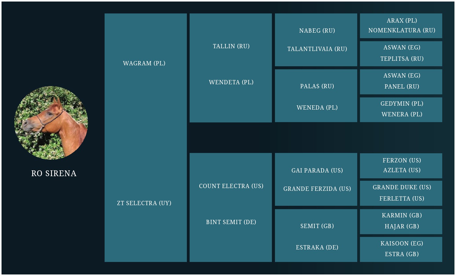 Yegua árabe ganadora de CEI1* 80 km, hermana paterna de 11 caballos ganadores de carreras de endurance en Argentina (entre ellos 2 yeguas Campeonas Nacionales en 160 km, RO Nadia y RO Orquídea) y 4 en Emiratos Árabes Unidos (RO Hamlet, RO Saad, RO Nilo (alias Super) y RO Fabiola; estos últimos dos, ganadores de la prestigiosa President of the UAE Cup 160 km en 2004 y 2005 respectivamente, ambos rompiendo el récord de velocidad vigente a la fecha) y a su vez, hermana entera de dos padrillos productores de ganadores: RO Attila (hijos ganadores: RO Liberal, RO Othar y RO Shy Doll) y RO Jordan ( exportado a Chile al Haras el Molino, hijos ganadores: CL Flash, CL Frodo, CL Katana y MC Dominga, entre otros).