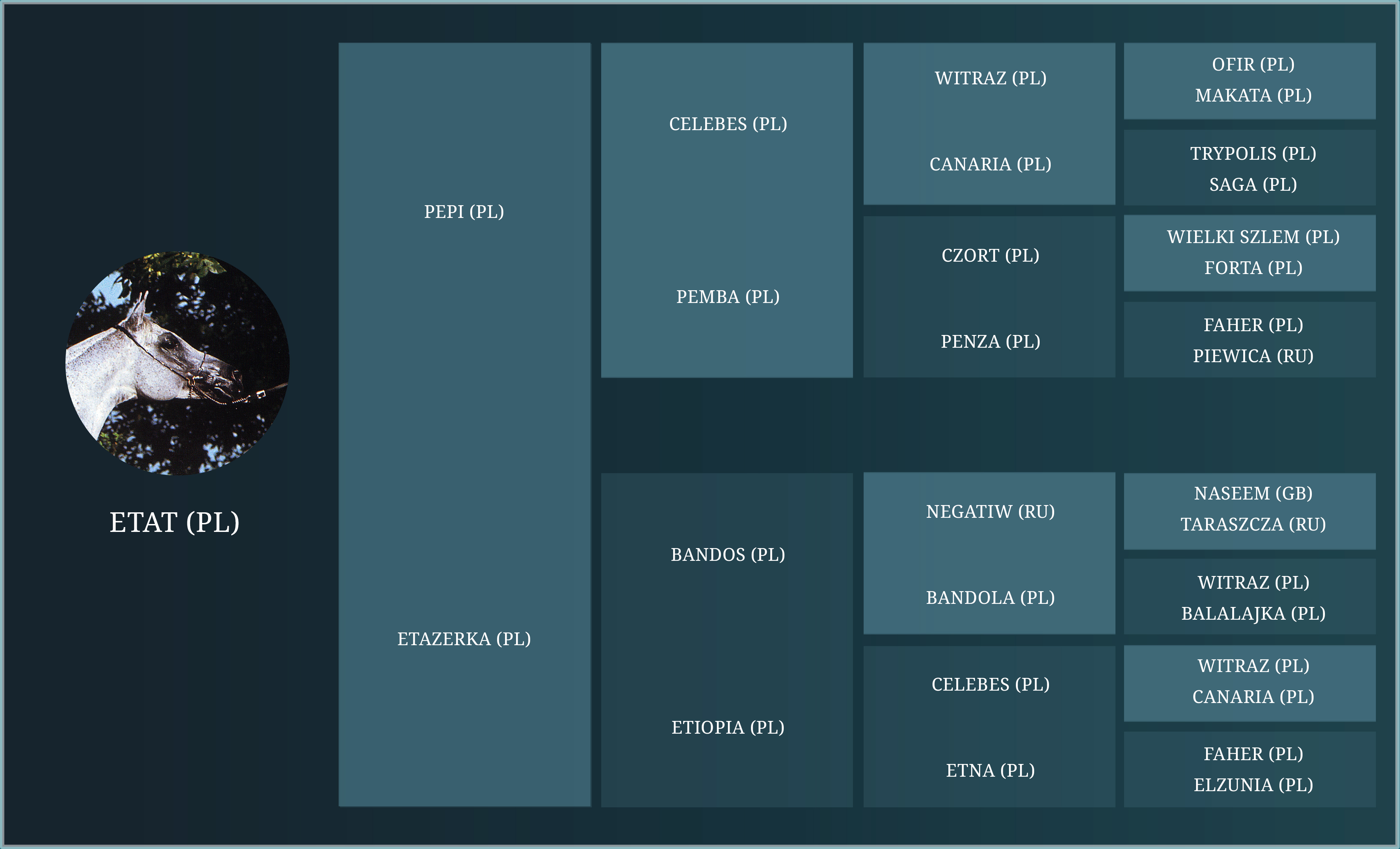 PEPI (PL) & ETAZERKA (PL) X BANDOS (PL), grey stallion, born 14/03/1981. Died: 17/09/2008. Etat was born in Poland, at the Janow Podlaski State Stud in 1981. After a successful flat racing career, he is imported to Denmark by Jorgen Frederiksen to Egholn Stud. In 1994, circumstances forced the dispersal of the Egholm stud and we incorporated its chief sire Etat to our breeding program. Etat’s damline goes back to Wolszka, 1810, the founder of the Polish female family nb. 10. His great great grand dam Elzunia was exported to Holland in 1960, but left the daughter Etna (by Faher) in Poland. Etna is an institution in Polish breeding; she became the dam of five breeding stallions (Etan by Czort, Etiw by Negatiw, Etap by Celebes, Eternit by Bandos, and Etnograf by Engano) and several daughters of the highest quality: Etruria by Palas, Equitana by Aloes, Etamina by Ellorus, Etiologia by Celebes, and Etiopa also by Celebes. Etiopa was sold to the USA in 1977, but left a daughter in Poland – Etazerka by Bandos. She was bred to Pepi and produced her first foal in 1981 – Etat. Etat’s sireline is that of Kuhailan Haifi, a desert bred stallion, imported to Gumniska, Poland in 1931. This line includes as great individuals as Ofir (x Dziva) and his famous W sons – Witez II (x Konfederacja), Witraz (x Makata), and Wielki Szlem (x Elegantka). The Witraz son Celebes (x Canaria) was bred by Albigowa and sold to a circus where he worked for 14 years before the state studs bought him back to reinstate him as a breeding stallion. It soon became apparent that this was a good decision. He passed on the ‘Kuhailan’ attributes and very good movement as well. He sired several good stallions including Pepi (x Pemba), the sire of Etat. Etat´s sons were very successful in the show ring in Denmark (including 14 champions in only one year) and here in Argentina he produced excellent endurance horses as RO Fantasia (by Khadjane NA) and RO Muskat (by Ro Sindirela) both exported to United Arab Emirates. Today his bloodline is alive through our broodmare RO Dulcinea (LC Diablo (US) & Ewita (DEN) x Etat (PL)) dam line granddaughter of Etat.