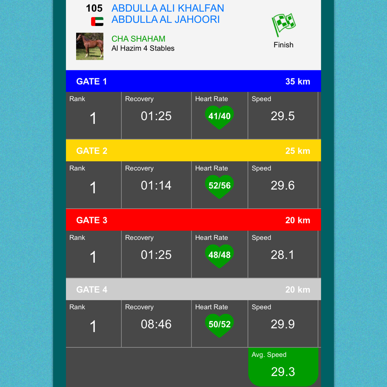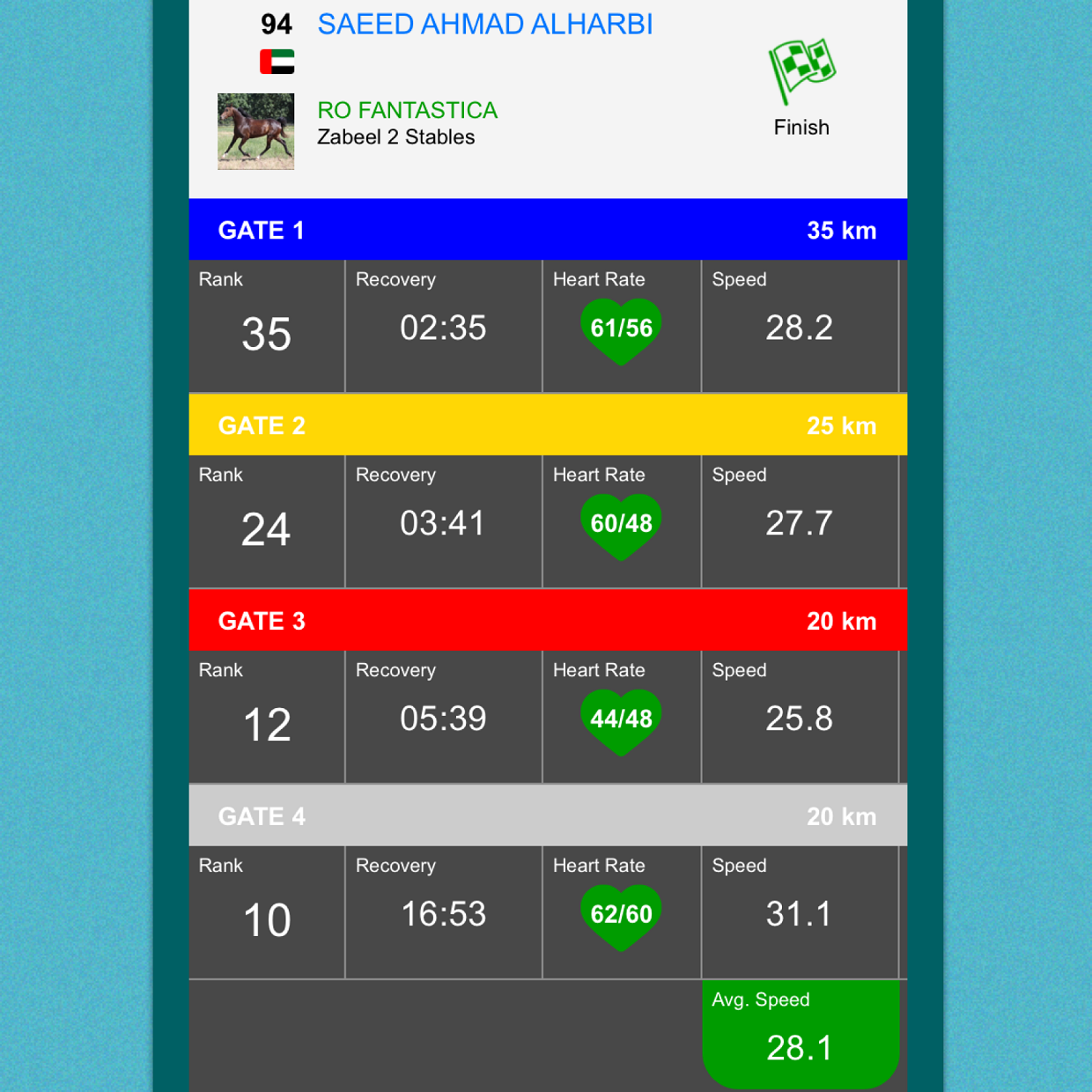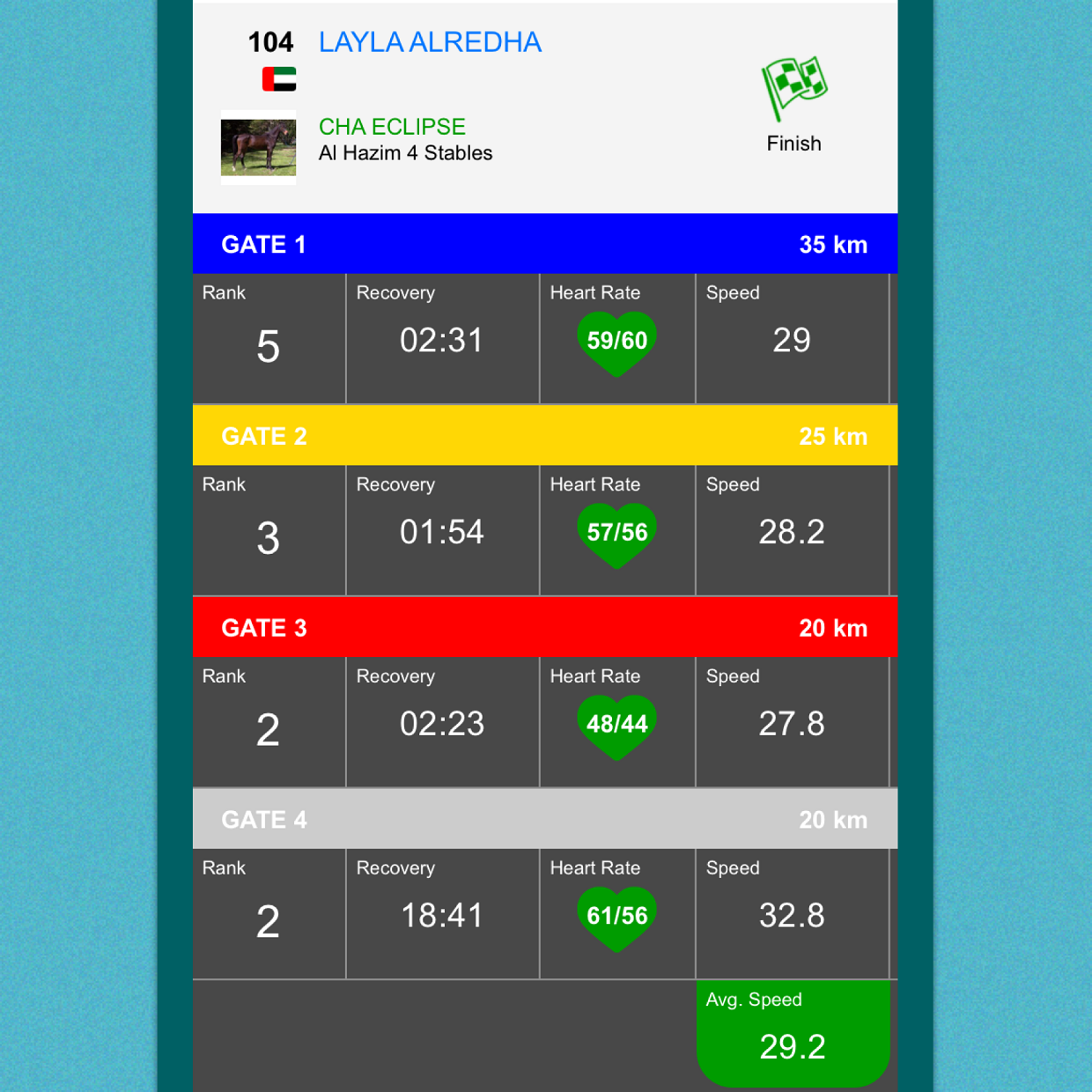 RO CASTAÑO fue montado por Abdulla Ali Khalfan Abdulla al Jahoori, terminando en 1° posición a una velocidad promedio final de 29,3 km/h y RO ECLIPSE por Layla Alredha, finalizó en 2° lugar a 29,2 km/h; ambos son entrenados en el establo Al Hazim 4.