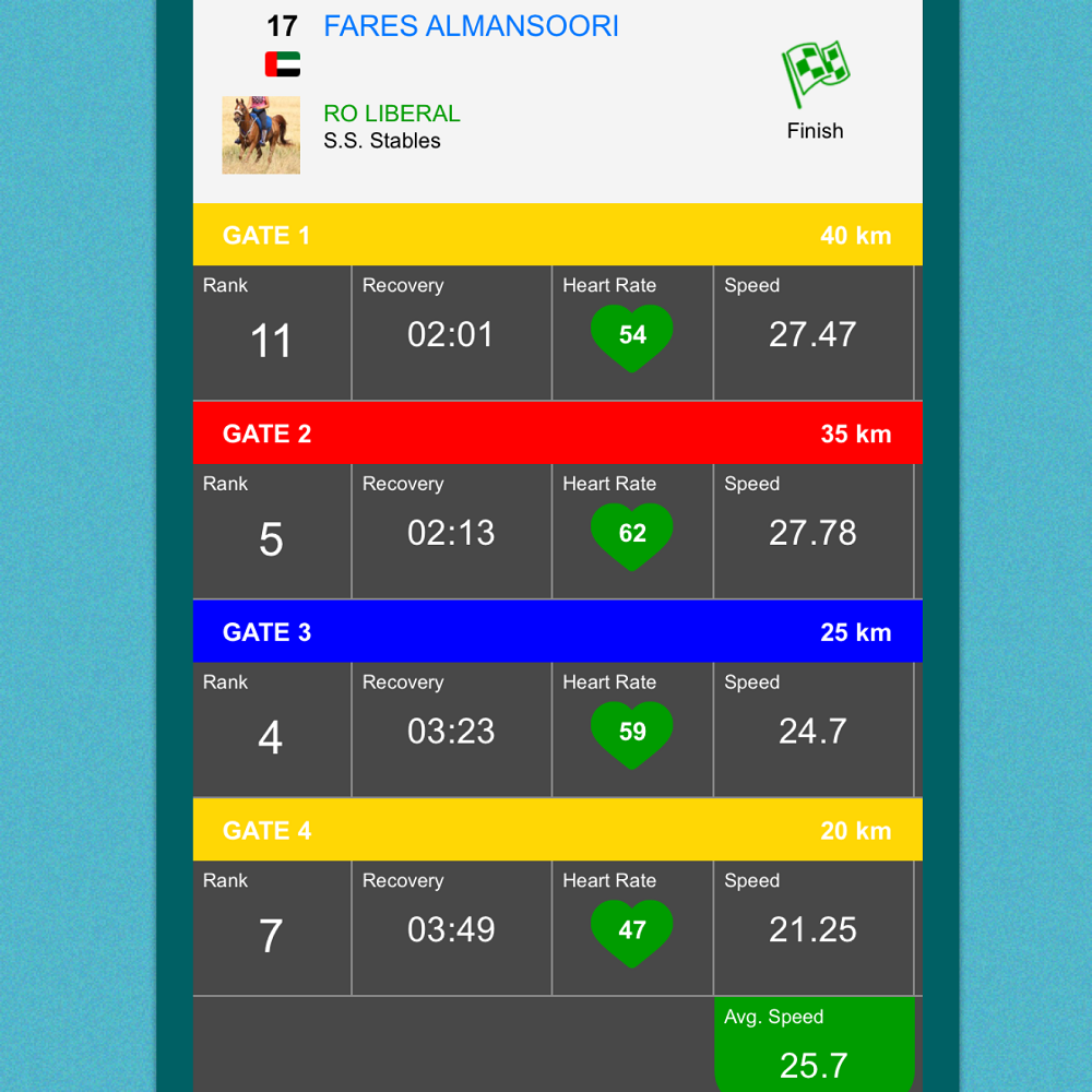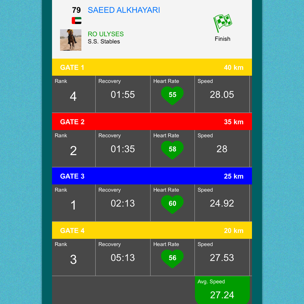 RO ULYSES (Wagram (PL)), con la monta de Saeed Alkhayari, quedó en la 3° posición con una velocidad final promedio de 27,24 km/h y RO LIBERAL (RO Attila), con la monta de Fares Almansoori, quedó en la 7° posición a 25,7 km/h; ambos fueron entrenados en el establo SS-2.