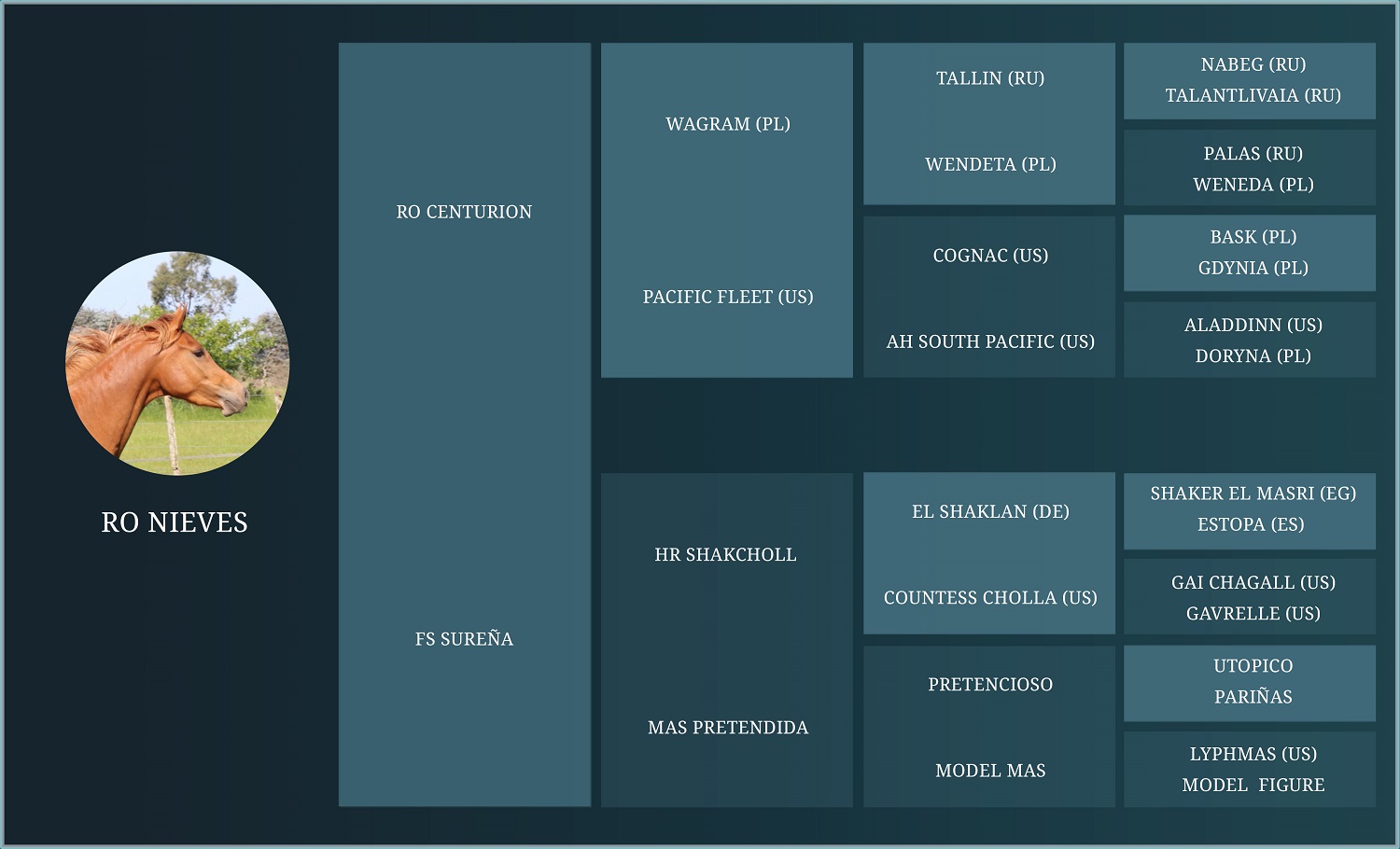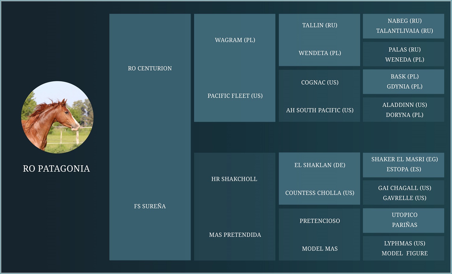 RO Patagonia es una yegua angloárabe (75% árabe), hija de nuestro padrillo múltiple ganador de carreras de endurance RO Centurión (Wagram (PL)) (hermano entero de RO FABIOLA, ganadora en EAU).